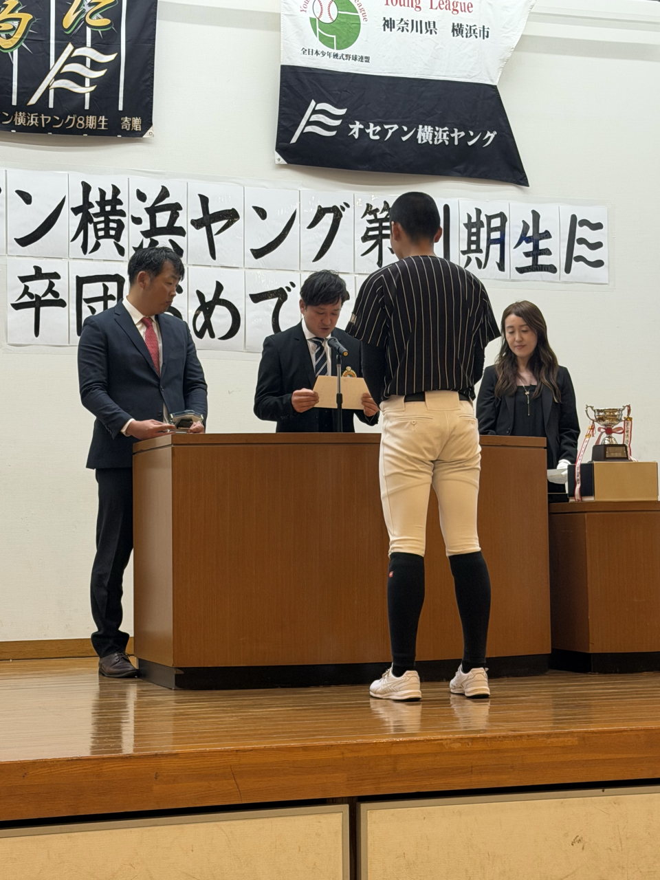 在団生代表による送辞、卒団生代表による答辞では、仲間と過ごした日々への感謝や、支えてくださった保護者・関係者の皆さまへの思いが語られました。また、卒団生から保護者の皆さまへ記念球が贈呈される場面では、これまでの支えに対する感謝の気持ちが伝わり、会場は穏やかな感動に包まれました。